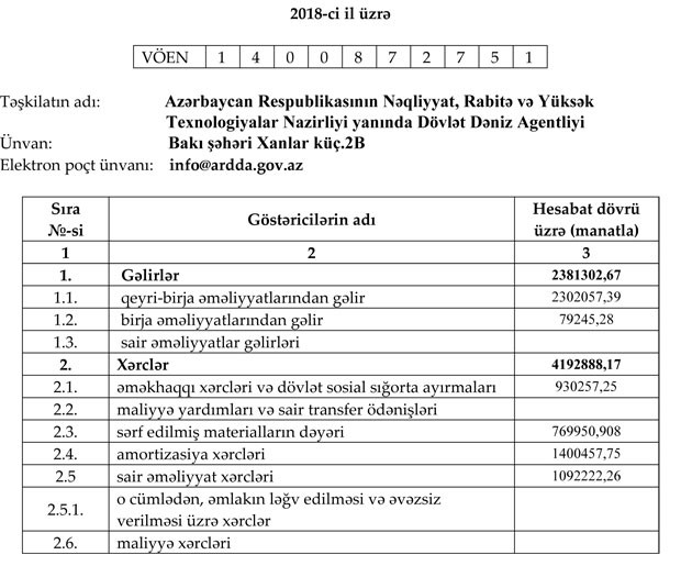 Nəqliyyat, Rabitə və Yüksək Texnologiyalar Nazirliyi yanında Dövlət Dəniz Agentliyi 2018-ci ili 1 milyon 812 min manat xalis zərər ilə başa vurub.