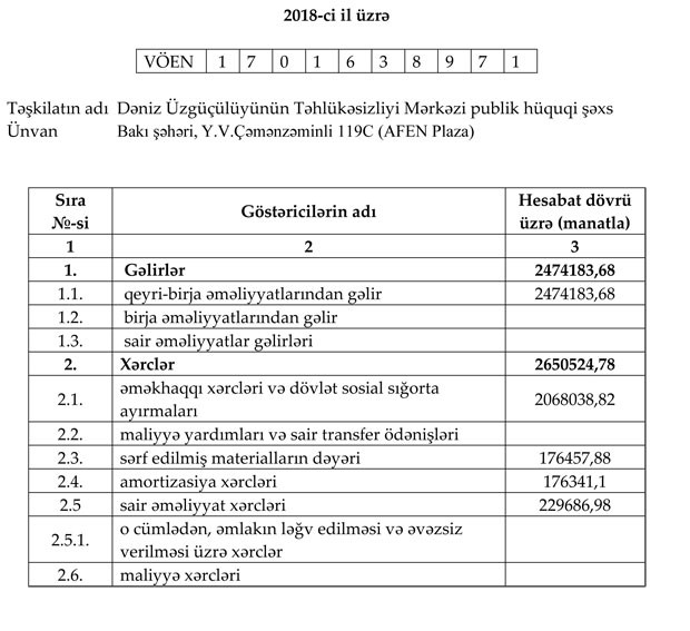 Həmçinin, ötən il Dəniz Üzgüçülüyünün Təhlükəsizliyi Mərkəzi publik hüquqi şəxsin cəmi gəlirləri 2 milyon 474 min manat, cəmi xərcləri isə 2 milyon 650 min manat təşkil edib. Nəticədə Mərkəz ötən ili 176 min manat zərər ilə bağlayıb.