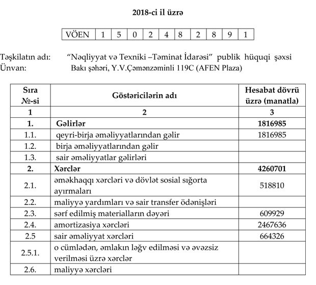 Bundan başqa, ötən il “Nəqliyyat və Texniki –Təminat İdarəsi” publik hüquqi şəxsin cəmi gəlirləri isə 1 milyon 817 min manat, cəmi xərcləri isə 4 milyon 261 min manat təşkil edib. Nəticədə 2 milyon 444 min mnat zərər yaranıb.