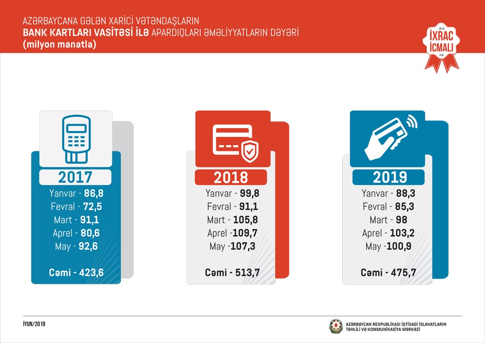 2019-cu ilin yanvar-may ayları ərzində Azərbaycana gələn xarici vətəndaşların bank kartları vasitəsi ilə apardıqları əməliyyatların dəyəri 475,7 milyon manat olub.