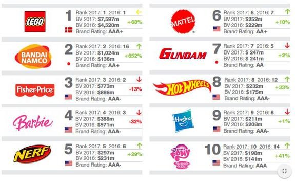 Hesabatda, "Lego"dan sonra "Bandai Namco" və "Fisher-Price"ın müvafiq olaraq 1 milyard dollar və 773 milyon dollarlıq dəyərlərlə ikinci və üçüncü yeri tutduqları qeyd edilir.