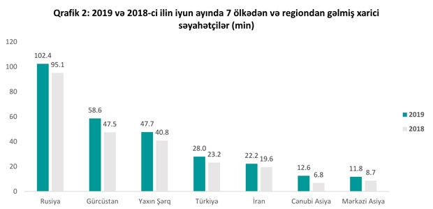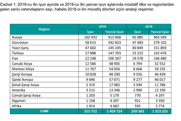 2019-cu ilin iyun ayında gələnlərin sayında əhəmiyyətli dərəcədə artım müşahidə olunub – bu artım 17.2% təşkil edib. Bu tendensiya özünü Azərbaycan turizmi üçün xarakterik olan bütün ölkələr üzrə göstərib.