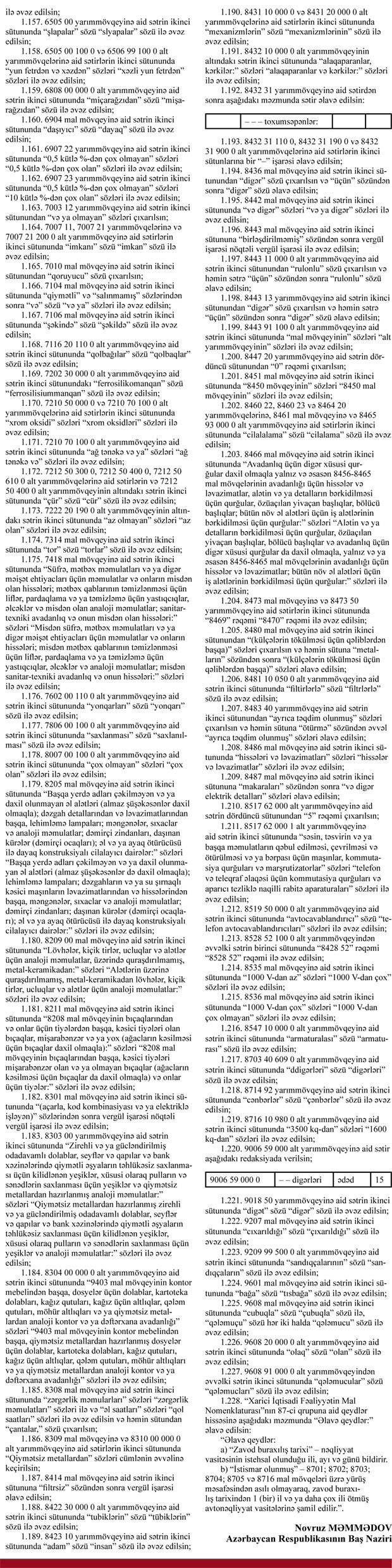 “Azərbaycan Respublikasının xarici iqtisadi fəaliyyətin mal nomenklaturası, idxal gömrük rüsumlarının dərəcələri və ixrac gömrük rüsumlarının dərəcələri”ndə bir sıra dəyişikliklər edilib.