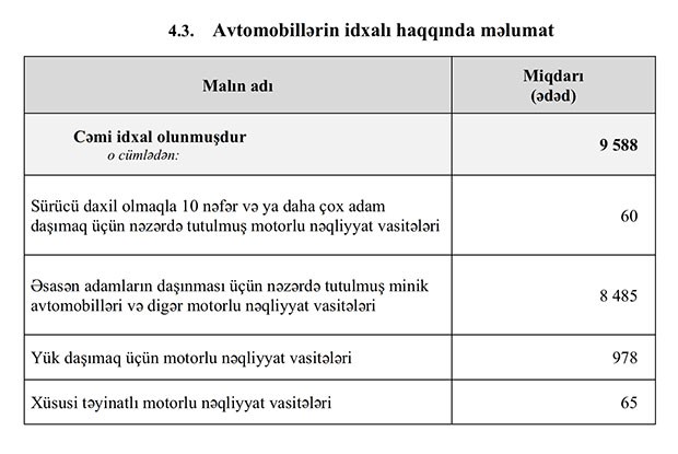 O cümlədən, 2019-cu ilin Yanvar-İyun aylarında 16 min 965 ədəd minik avtomobili, 101 ədəd avtobus, 1 593 ədəd yük avtomobili və 81 ədəd xüsusi təyinatlı vasitə idxal olunub.
