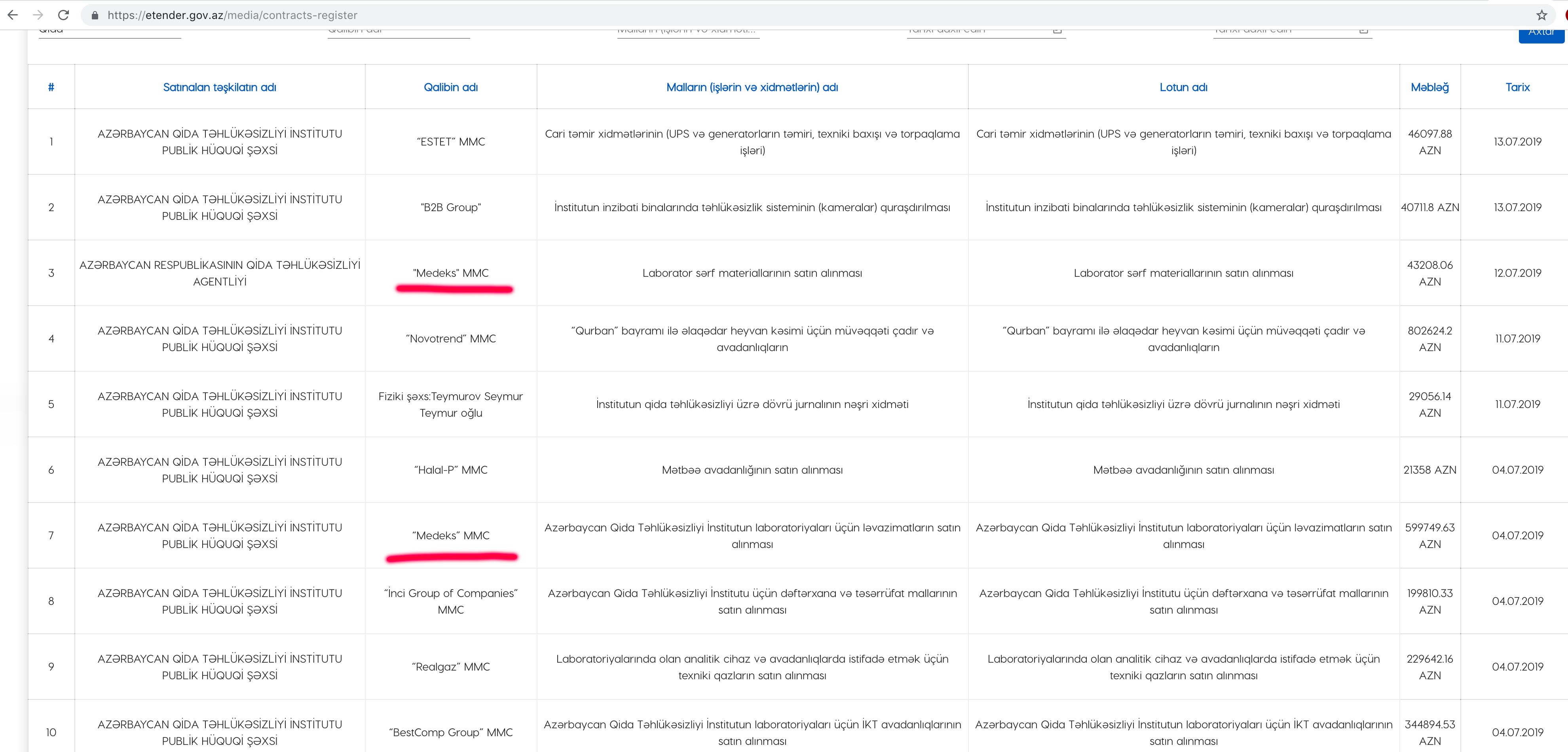 Həmçinin İyulun 7-də Azərbaycan Qida Təhlükəsizliyi İnstitutu laboratoriyaları üçün ləvazimatların satın alınması üçün "Medeks" MMC ilə müqavilə imzalayıb. Müqavilənin məbləği 599 min 749 manatdır.