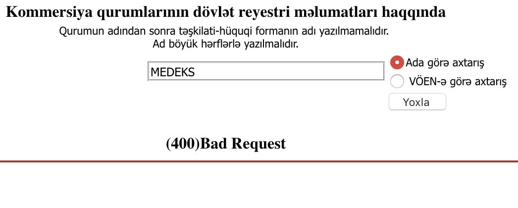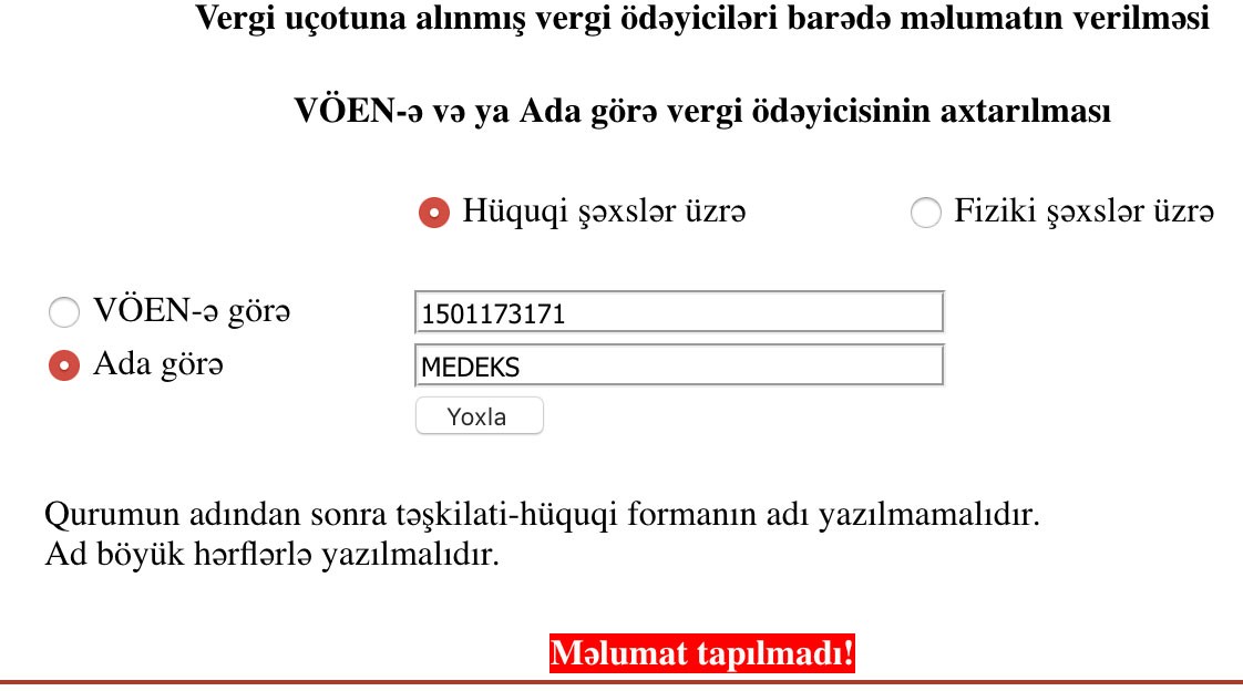 Vergilər Nazirliyinin Kommersiya qurumlarının dövlət reyestrindən "Medeks" MMC barədə məlumat almaq mümkün deyil.
