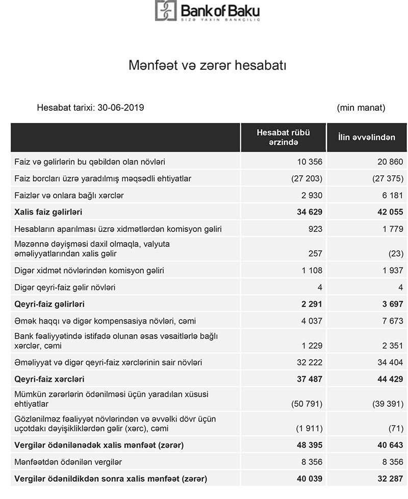 “Bank of Baku” ASC 2019-cu ilin 1-ci yarısını 32 milyon 287 min manat xalis mənfəət ilə başa vurub. Halbuki, Bank ötən ilin eyni dövrünü 1 milyon 836 min manat xalis mənfəət ilə bağlamışdı. Beləliklə, “Bank of Baku”nun xalis mənfəəti 17,5 dəfə artıb. Artımın səbəbi əvvəlki illər ehtimal olunan kredit itkiləri üzrə yaradılmış ehtiyatın bir hissəsinin azad olmasıdır. Dövlət büdcəsindən dollar kreditlərinə kompensasiyanın verilməsi problemli kreditləri xeyli həll etmiş və nəticədə bir sıra banklar kimi “Bank of Baku”nun da bu məqsədlə yaradılmış ehtiyatı azad olub.