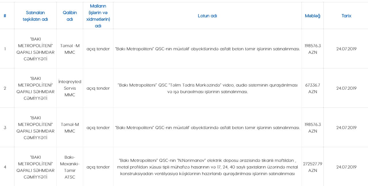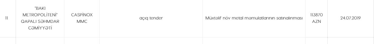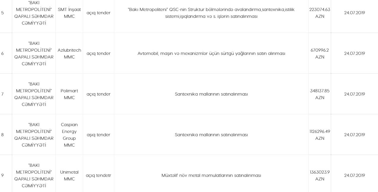 Həmçinin "Hemat Trade" MMC və "CASPİNOX" MMC "Müxtəlif növ metal məmulatlarının satınalınması" üzrə açıq tenderin qalibləri olub. Qaliblər ilə müvafiq olaraq 426 min 830 manatlıq və 113 min 870 manatlıq satınalma müqaviləsi imzalanıb.