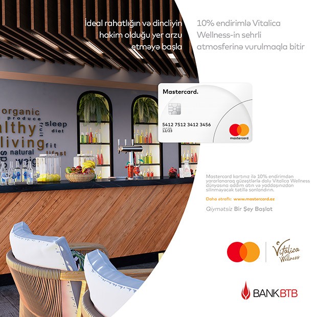 Artıq Azərbaycandakı Mastercard® və Maestro® kart sahibləri Türkiyənin Bodrumdaki məşhur Vitalica Wellness sağlamlıq və detox mərkəzinin sehrli atmosferi, təmiz havası və ən əsas illər ərzində toplanmış düzqün qidalanma və sağlamlıq proqramları ilə tanış ola biləcəklər. Bank BTB-nin Mastercard® və Maestro® kredit və debet kart sahibləri sağlamlıq mərkəzinin təqdim etdiyi xidmətlərə 10% endirim qazanmış olacaqlar.