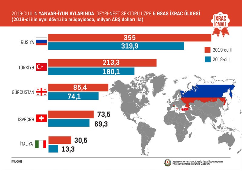 Bu ilin ilk yarısında Rusiyaya 355 milyon, Türkiyəyə 213,3 milyon, Gürcüstana 85,4 milyon, İsveçrəyə 73,5 milyon və İtaliyaya 30,5 milyon ABŞ dolları dəyərində qeyri-neft sektoruna aid mal ixrac edilib.