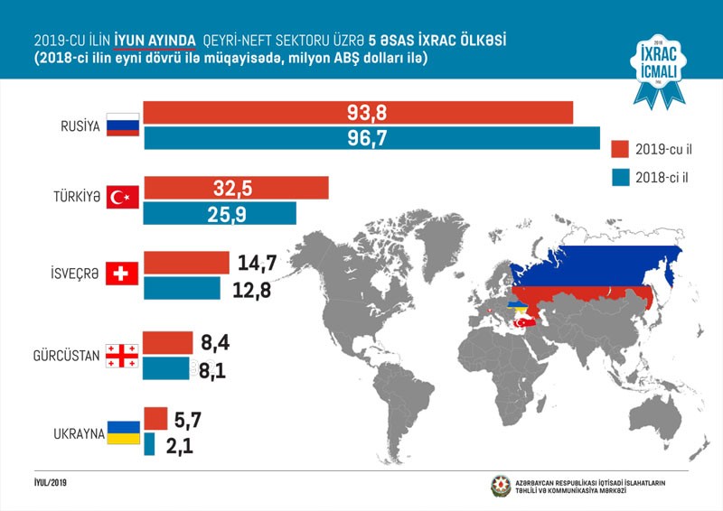 2019-cu ilin birinci yarısında 2018-ci ilin müvafiq dövrü ilə müqayisədə Rusiyaya qeyri-neft ixracı 11 faiz, Türkiyəyə 18 faiz, Gürcüstana 15 faiz, İsveçrəyə 6 faiz və İtaliyaya 2,3 dəfə artıb.
