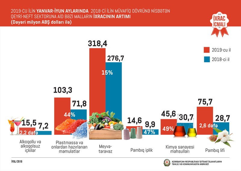 2018-ci ilin müvafiq dövrü ilə müqayisədə cari ilin yanvar-iyun aylarında pambıq lifinin ixracı 2,6 dəfə, alkoqollu və alkoqolsuz içkilərin ixracı 2,2 dəfə, kimya sənayesi məhsullarının ixracı 49 faiz, pambıq ipliyinin ixracı 47 faiz, plastmassa və onlardan hazırlanan məmulatların ixracı 44 faiz, meyvə-tərəvəzin ixracı 15 faiz artıb.