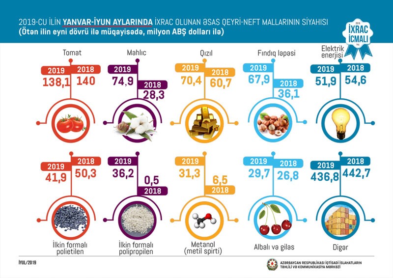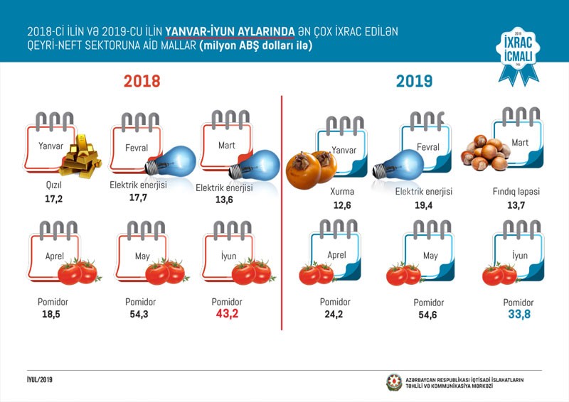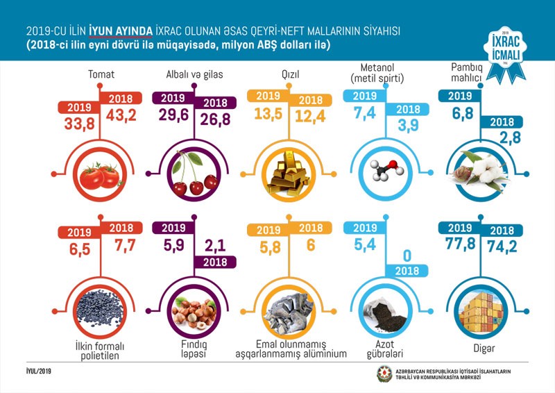 2019-cu ilin may ayında olduğu kimi iyun ayında da qeyri-neft sektoru üzrə ixracda pomidor (33,8 milyon ABŞ dolları) birinci olub. Bu siyahıda albalı və gilas (29,6 milyon ABŞ dolları) ikinci, qızıl (sikkə kəsilməsində istifadə olunmayan, digər emal olunmamış formalarda - 13,5 milyon ABŞ dolları) üçüncü yerdə qərarlaşıb.
