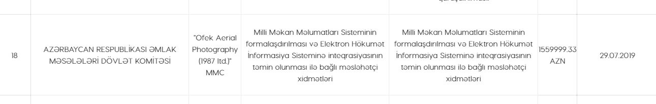 “Marja” xəbər verir ki, "Ofek Aerial Photography (1987 ltd.)" MMC Dövlət Komitəsinə Milli Məkan Məlumatları Sisteminin formalaşdırılması və Elektron Hökumət İnformasiya Sisteminə inteqrasiyasının təmin olunması ilə bağlı məsləhətçi xidmətləri göstərəcək. Müqavilənin məbləği 1 milyon 559 min 999.33 manatdır.