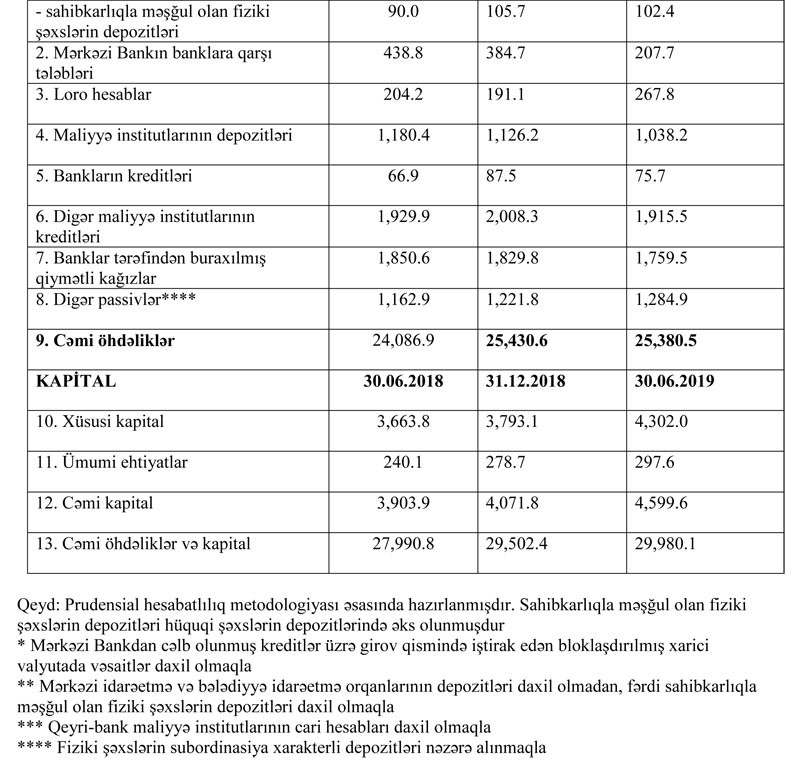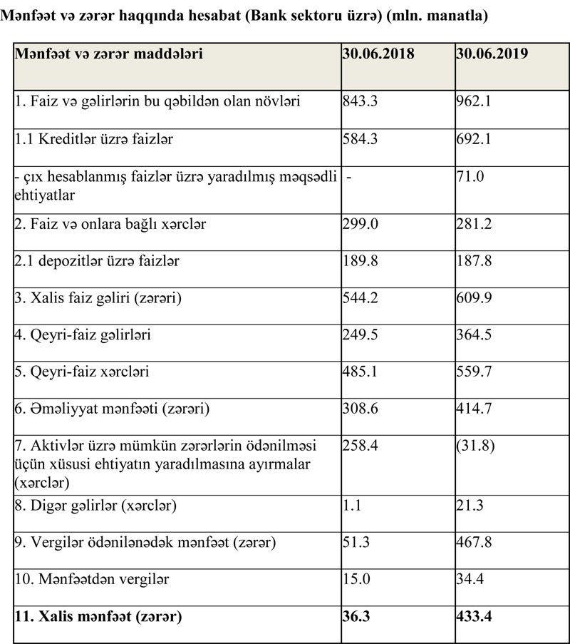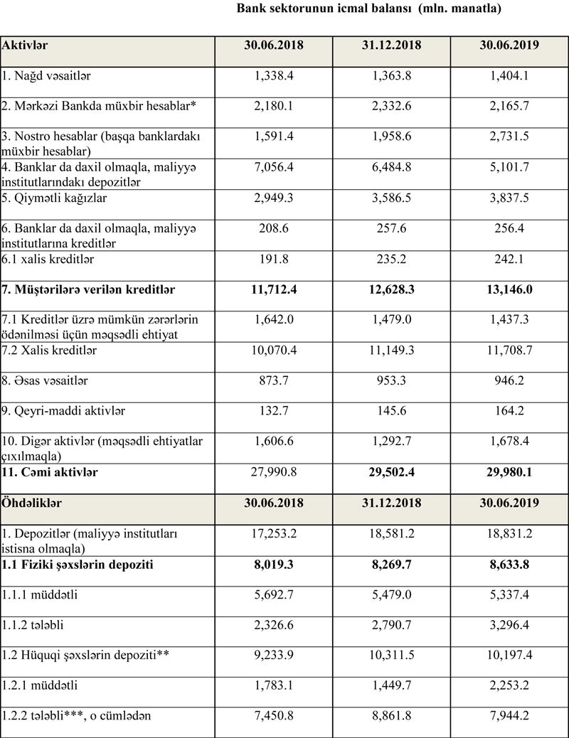 30 İyun 2019-cu il tarixində Azərbaycanın bank sektorunun aktivləri 30 milyard manata yaxınlaşıb. İlk 6 ayda müştərilərə verilən kreditlər yarım milyard manatdan çox artıb. Bank sektorunda faiz, qeyri-faiz gəlirləri və xalis mənfəət də artıb.