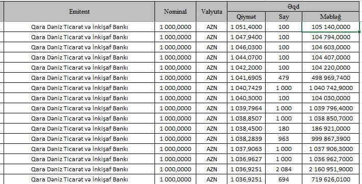 Nominal qiyməti 1000 manat olan istiqrazlar hərracda 1036,9251 manat - 1051,40 manat aralığında qiymətlərə yerləşdirilib.