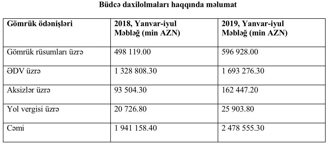 2019-cu ilin 7 ayı ərzində Dövlət Gömrük Komitəsinin xəttilə dövlət büdcəsinə 2 milyard 478 milyon 555 min manat daxil olub.