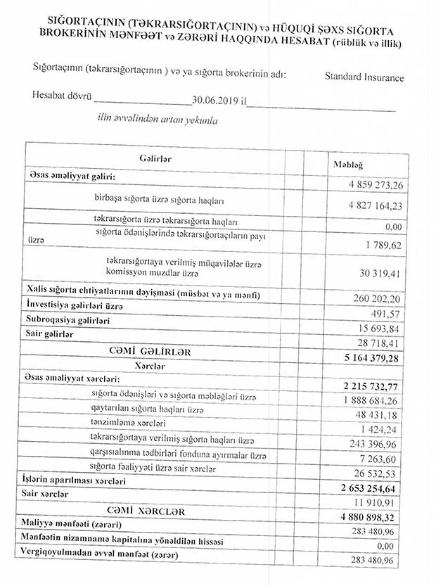 Müqayisə üçün qeyd edək ki, 2018-ci ilin 1-ci yarısında “Standard İnsurance”ın cəmi gəlirləri 4 milyon 892 min manat, cəmi xərcləri isə 5 milyon 266 min manat təşkil etmiş və xərclər gəlirləri üstələdiyindən 375 min manat zərər yaranmışdı.