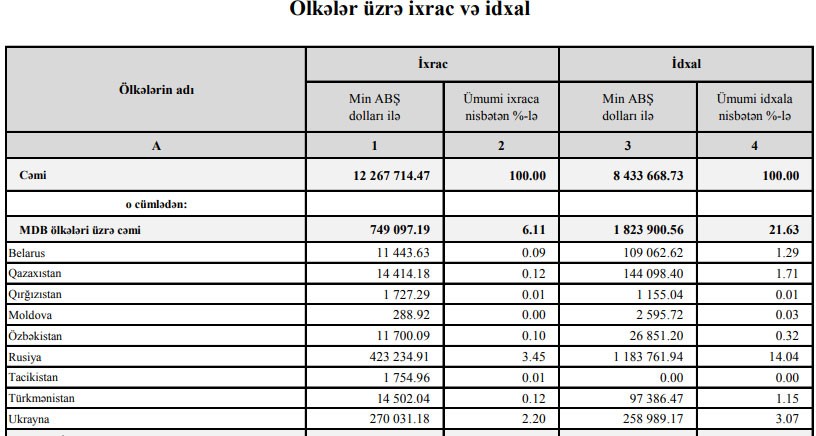 Azərbaycanın ən çox məhsul ixrac etdiyi MDB ölkələri
