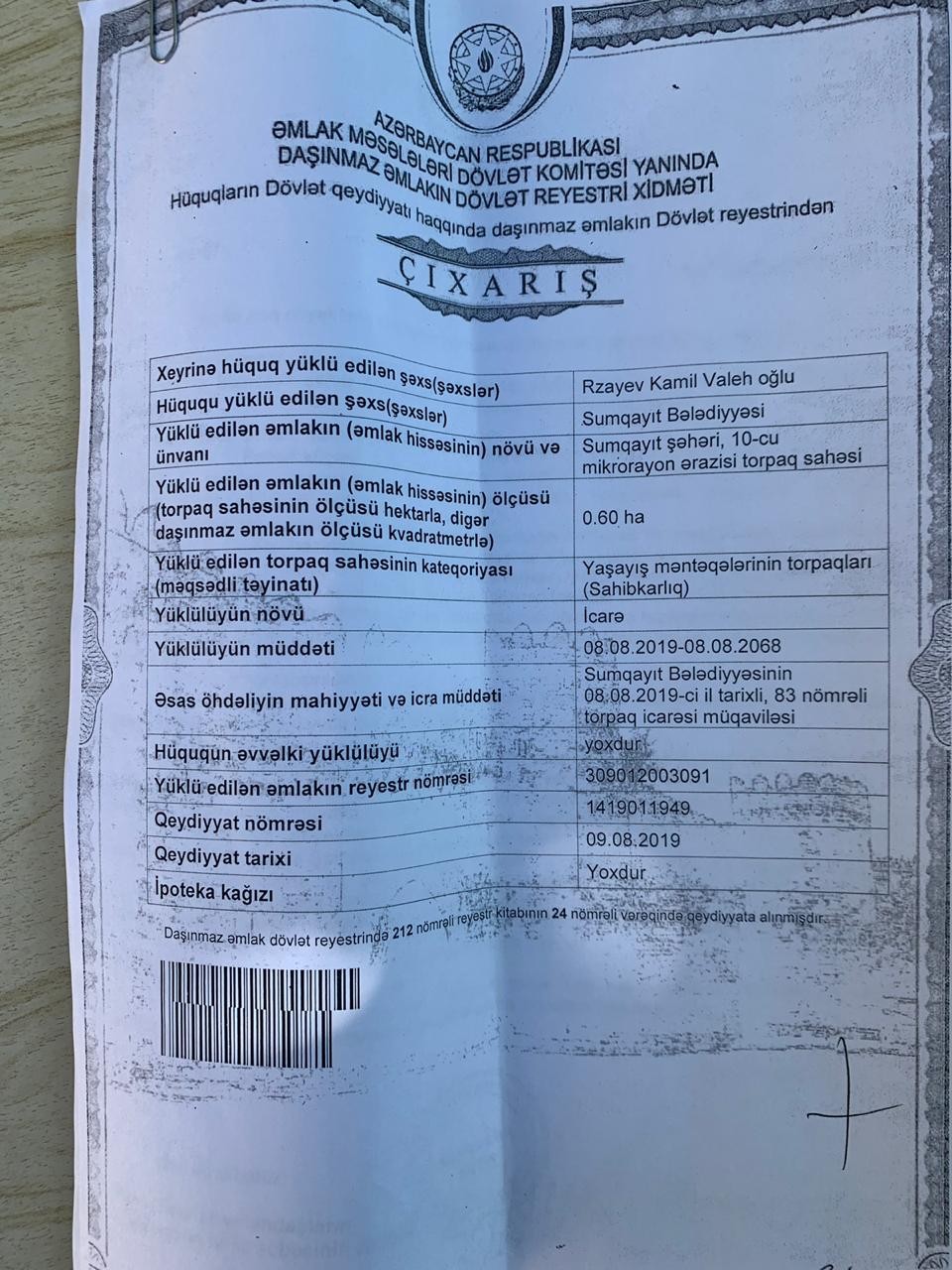 “Torpaq “Fuad MTK”nın ərazisi kimi rəsmiləşdirilib. Həmin ərazi 8 bloklu binanın tikilməsi üçün layihələndirilib. 2 blok artıq tikilib. Sumqayıt bələdiyyəsi 2018-ci ildə Sumqayıt İnzibati İqtisad Məhkəməsinə müraciət edərək torpağın təyinatı üzrə istifadə olunmadığına dair iddia qaldırıb. Məhkəmə həmin iddianı rədd edərək iddiaçını 200 manat məbləğində cərimə edib. 2019-cu ilin yanvar ayında bələdiyyə məhkəmə qərarı olmadan bizim icarə müqaviləsini ləğv edib. Bizim icarə müqaviləsi isə cari ilin dekabrın 31-nə kimi qüvvədədir. Torpağın 60 sotunu Rzayev Kamil Valeh oğlunun adına rəsmiləşdiriblər. Biz tikintini 2015-ci ildən davam etmək istəyirik. Ancaq ərazidə olan drenaj sistemi, kafelər tikinti aparmağımıza mane olur. Biz bu qanunsuz ləğvedilmə məsələsi ilə bağlı məhkəməyə müraciət etmişik. Məhkəmə iclası avqustun 28-də keçiriləcək”.