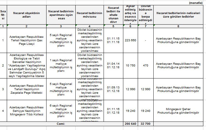 2019-cu ilin birinci yarısında, dövlət büdcəsindən maliyyələşən 2 rayon icra hakimiyyətinə, 1 şəhər sahə ərazi nümayəndəliyinə, 1 təhsil müəssisəsinə, 2 məhdud məsuliyyətli cəmiyyətə, eyni zamanda, bir neçə şəhər və rayonlarda yerləşən büdcə təşkilatlarına ayrılmış vəsaitlərin təyinatı üzrə xərclənməsi üzrə nəzarət tədbirləri həyata keçirilib.