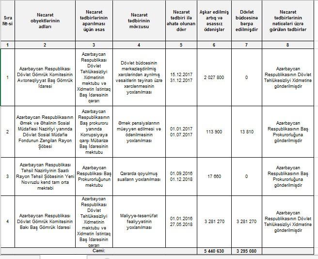 Eyni zamanda, 2019-cu ilin birinci yarısında Dövlət Maliyyə Nəzarəti Xidmətinin mütəxəssisləri tərəfindən hüquq-mühafizə və prokurorluq orqanlarının məktublarına, məhkəmələrin qərarlarına əsasən 4 təşkilatda aparılmış yoxlamalarla 5 milyon 440,63 min manat məbləğində artıq və əsassız ödənişlər aşkar edilib, təqsirkar şəxslər hesabına həmin vəsaitin 3 milyon 295,08 min manatının bərpası təmin olunub, müvafiq sənədlər aidiyyəti üzrə təqdim edilib.