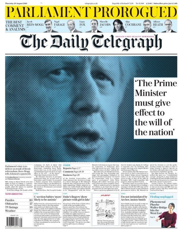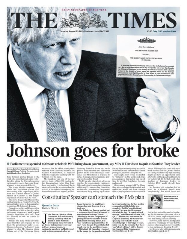"Financial Times" qəzeti, "Conson "Brexit" planını qorumaq üçün parlamenti bağladı" - yazıb. "Times" qəzeti "Conson qazanmaq üçün hər yolu sınayır" başlığını önə verib. "Brexit"i dəstəkləyən "Daily Telegraph" isə kabinetin parlament gündəmini müəyyən etməkdən məsul naziri Yakob Rees-Moggun "Baş nazir haqqın iradəsinin təcəlli etməsini təmin etməlidir" sözlərini manşetdən verib.