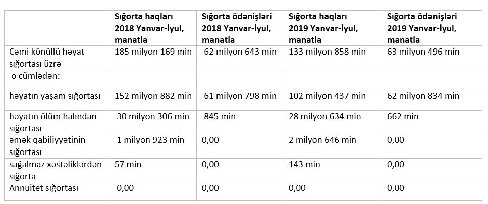 2019-ci ilin yanvar-iyul ayları ərzində Azərbaycanın 4 həyat sığortası şirkəti tərəfindən həyatın yaşam sığortası növü üzrə 102 milyon 436 min manat sığorta haqları toplanıb. Bu, ötən ilin eyni dövrü ilə müqayisədə 50 milyon 446 min manat və ya 33% azdır. 2019-ci ilin yanvar-iyul ayları ərzində həyat sığortası şirkətləri tərəfindən həyatın yaşam sığortası növü 152 milyon 882 min manat sığorta haqları toplanmışdı. Azalma vergi sahəsində aparılmış dəyişikliklər ilə bağlıdır.