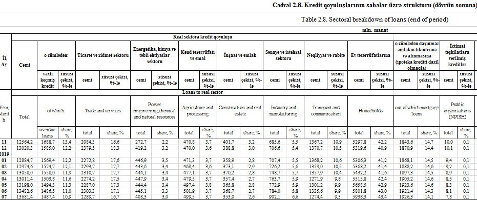 2019-cu ilin İyul ayında Azərbaycanda kredit qoyuluşları 198,7 milyon manat artaraq 13 milyard 681,3 milyon manata yüksəlib. İyunun sonunda kredit qoyuluşları 13 milyard 482,6 milyon manata çatmışdı.