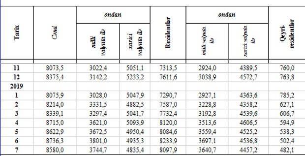 31 İyul 2019-cu il tarixinə fiziki şəxslərin banklardakı əmanətləri (əhalinin əmanətləri) 8 milyard 580 milyon manat təşkil edib.