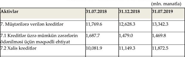 31 iyul 2019-cu il tarixində bankların müştərilərə verdiyi cəmi kreditlər 13 milyard 342,3 milyon manat təşkil edib. Kredit portfelinin 1 milyard 469,8 milyon manatı kreditlər üzrə mümkün zərərlərin ödənilməsi üçün yaradılmış məqsədli ehtiyatdan ibarət olub.