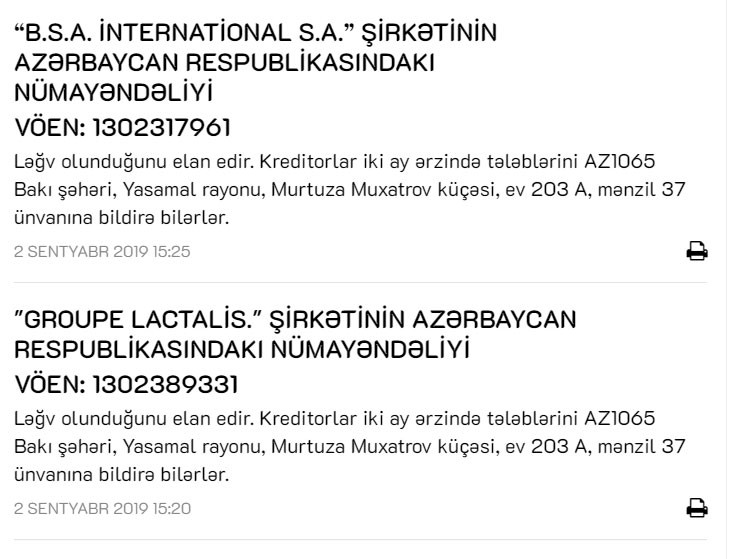 Həmçinin eyni ünvanda yerləşən "BSA Beynəlxalq SA" şirkətinin Azərbaycan Respublikasındakı nümayəndəliyi ləğv olunduğunu elan edir. Kreditorlar iki ay ərzində tələblərini AZ1065 Bakı şəhəri, Yasamal rayonu, Murtuza Muxatrov küçəsi, ev 203 A, mənzil 37 ünvanına bildirə bilərlər.