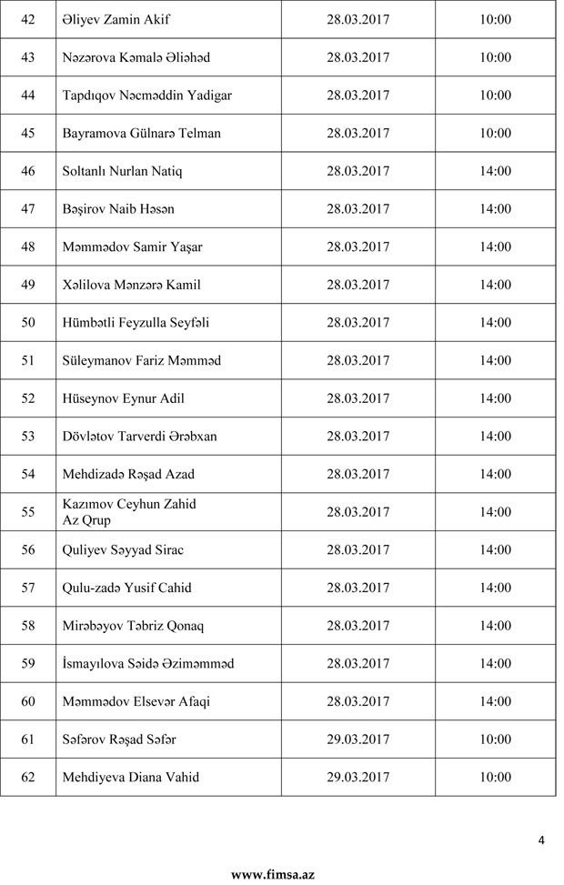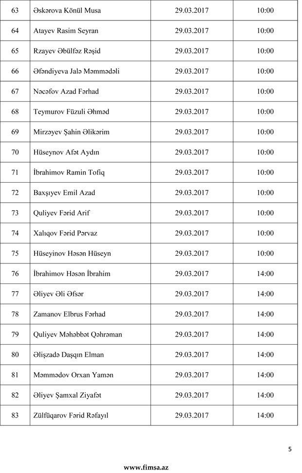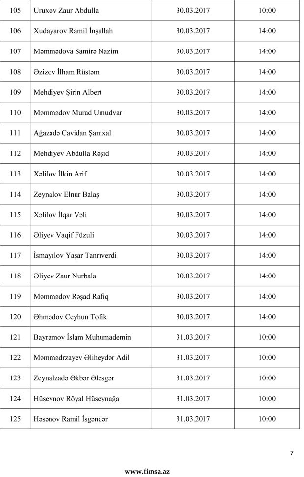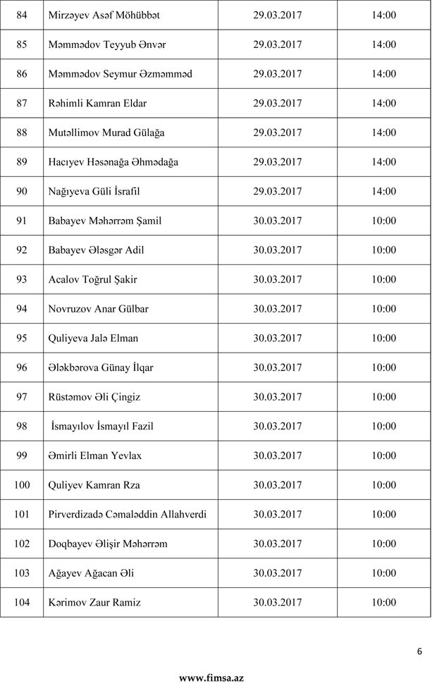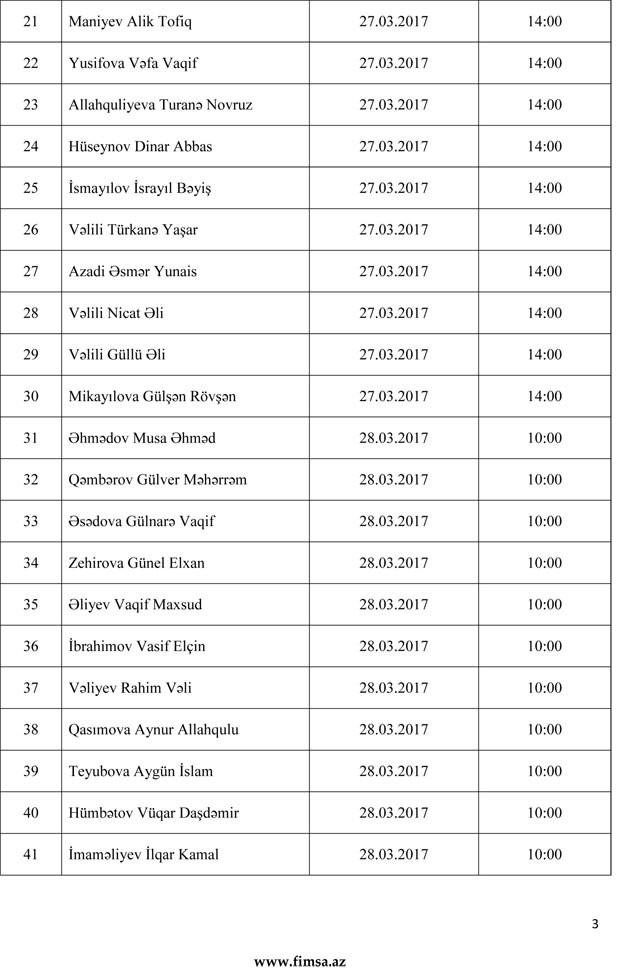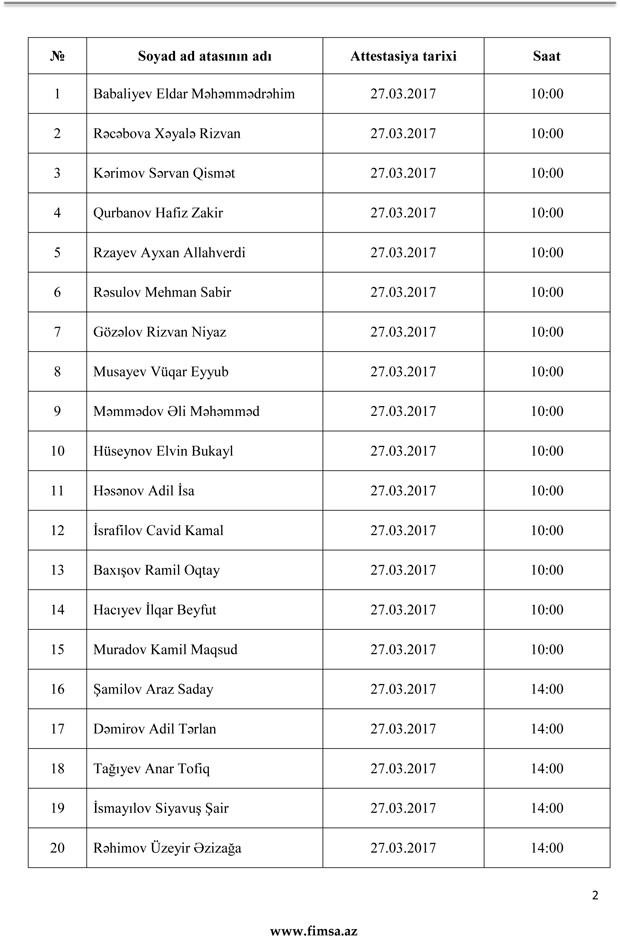Palatandan "Marja"ya daxil olmuş məlumata görə, namizədlər, 27 mart 2017-ci il tarixindən 31 mart 2017-ci il tarixinədək davam edəcək attestasiyanın yenilənmiş tarixi və vaxtı barədə məlumatı aşağıdakı siyahıdan əldə edə bilərlər.