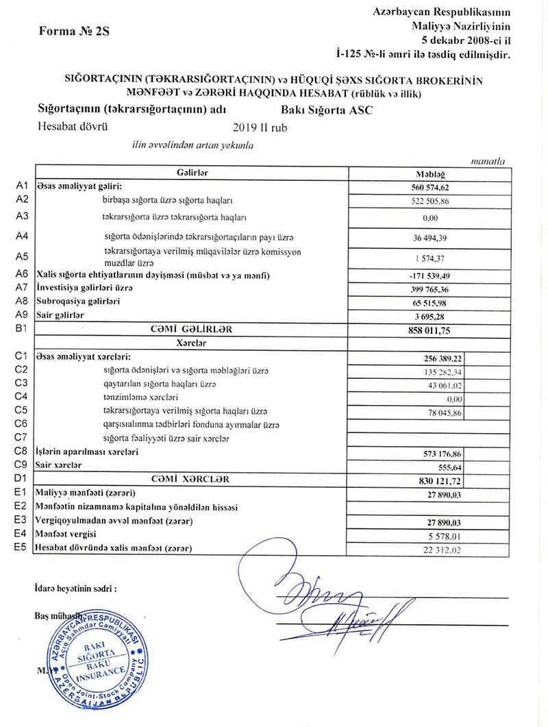 “Marja” şirkətin yarımillik hesabatına istinadən xəbər verir ki, 2019-cu ilin yanvar-iyun dövründə “Bakı Sığorta”nın cəmi gəlirləri 858 min manat, cəmi xərcləri isə 830 min manat təşkil edib. Şirkət təxminən 28 min manatlıq əməliyyat mənfəətindən 5578 manat mənfəət vergisi də ödəyib.
