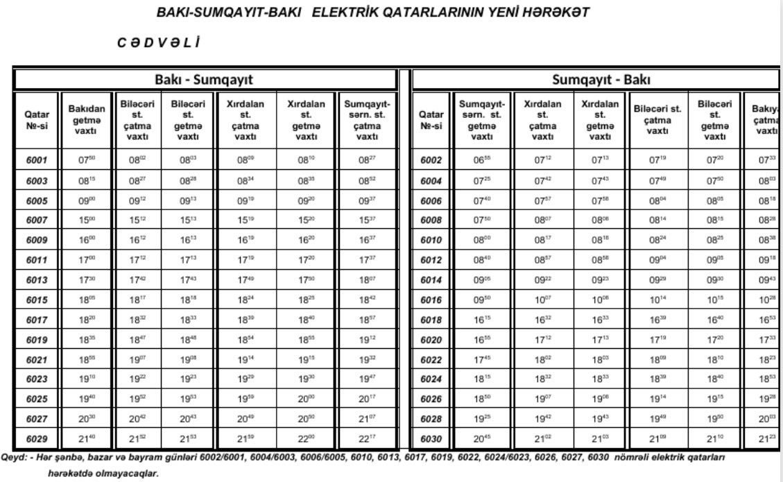 Yeni hərəkət cədvəlinə əsasən Bakı-Sumqayıt-Bakı marşrutu ilə işləyən elektrik qatarlarının dövriyyəsi artırılır. Gün ərzində bu marşrutla 15 cüt elektrik qatarı hərəkətdə olacaq. Eləcə də, sosial sifarişlər nəzərə alınaraq, birinci növbədə oxuyan tələbələrin dərsdən sonra daşınması üçün saat 15:00-a da qatar təyin edilir.