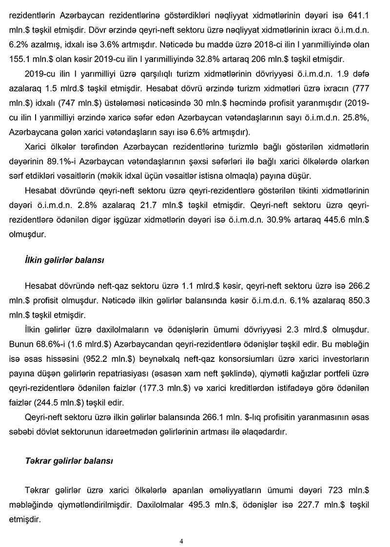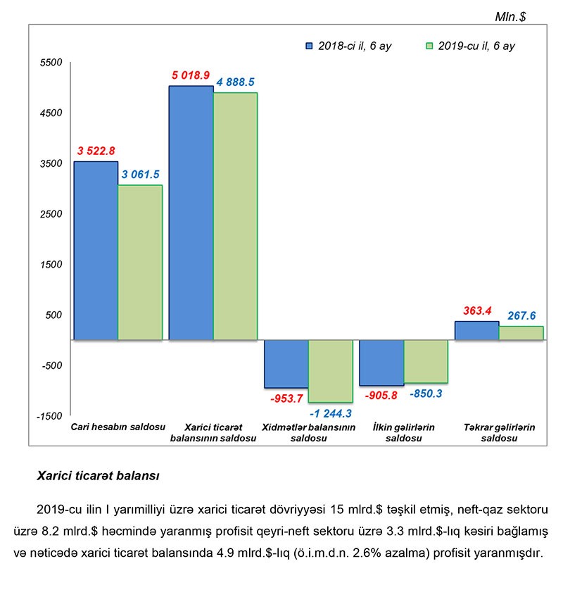2019-cu ilin 1-ci yarımilliyi üzrə cari əməliyyatlar hesabında 3.1 mlrd. dollar (ötən ilə müvafiq dövrünə nəzərən 13.1% azalma) məbləğində profisit yaranmış, o cümlədən neft-qaz sektoru üzrə profisit ötən ilə müvafiq dövrünə nəzərən 2.1% (132 mln.dollar) azalaraq 6.2 mlrd. dollar, qeyri-neft sektoru üzrə cari əməliyyatlar balansı kəsiri isə 11.9% (330 mln.dollar) artaraq 3.1 mlrd. dollar məbləğində olmuşdur. Nəticədə cari hesabın neft-qaz sektorunun profisiti qeyri-neft sektoru üzrə kəsiri tam örtmüşdür. Cari əməliyyatlar balansı ticarət balansının və təkrar gəlirlər balansının profisitinin xidmətlər balansının və ilkin gəlirlər balansının kəsirini tam örtməsi hesabına formalaşmışdır.