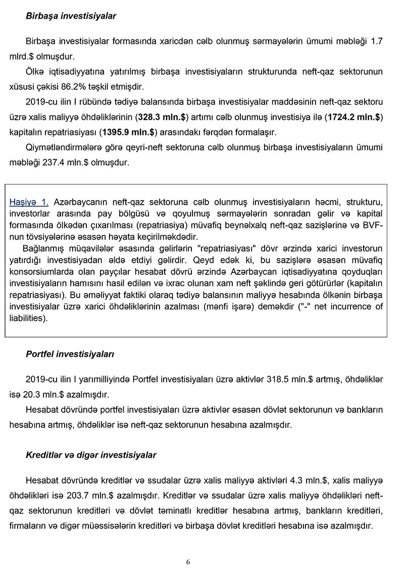 Müqayisə üçün qeyd edək ki, 2018-ci ilin 1-ci yarısında Azərbaycanın tədiyyə balansının profisiti 2 milyard 419 milyon dollar təşkil etmişdi. Beləliklə, tədiyyə balansının profisiti 50% artıb.