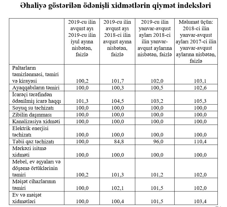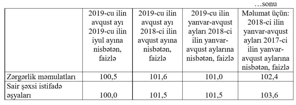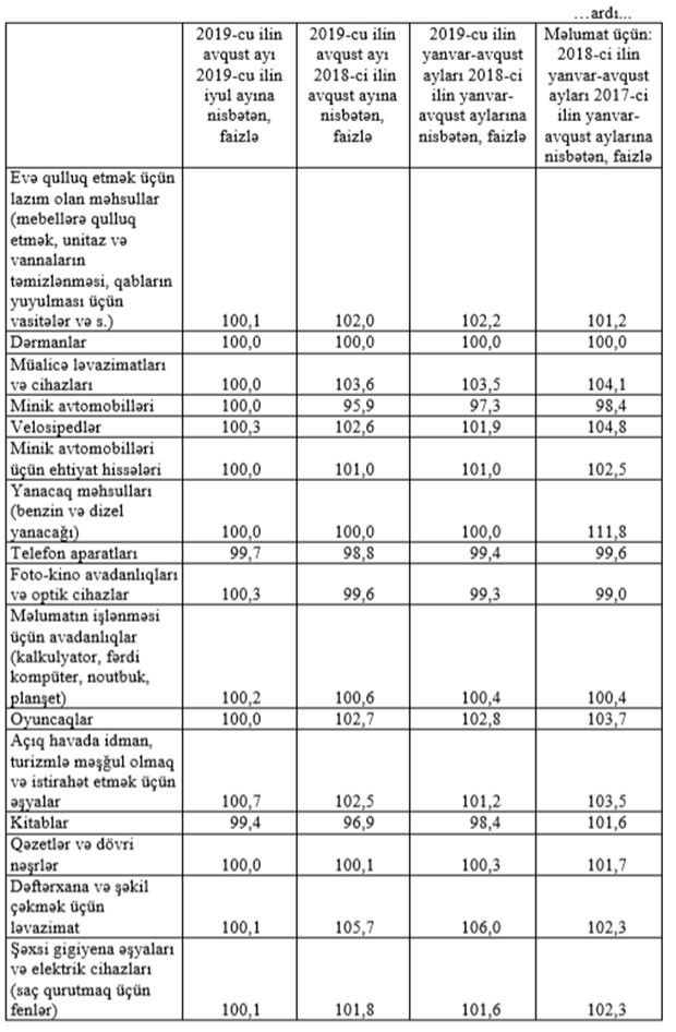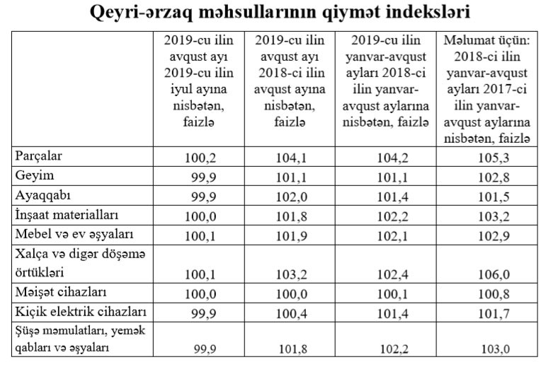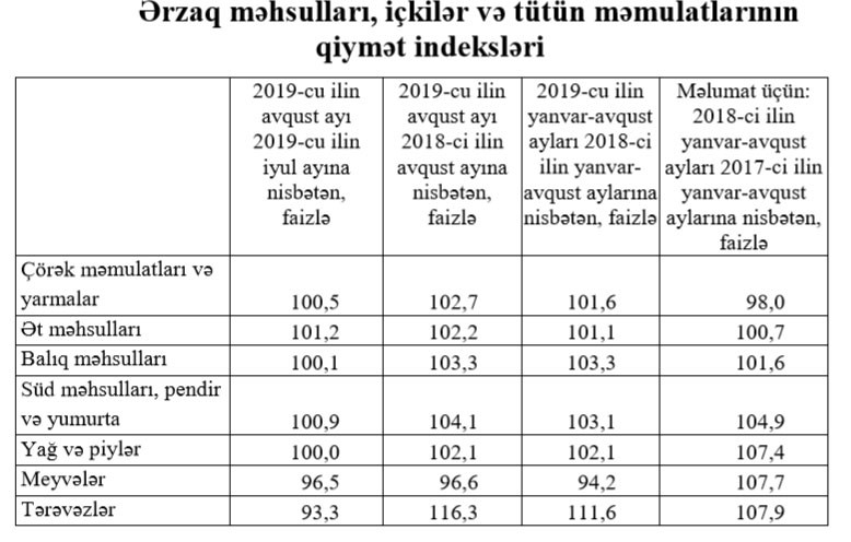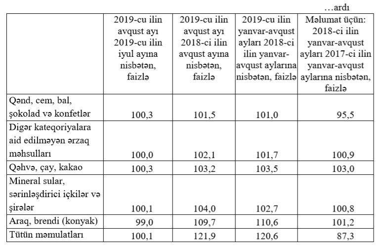 2019-cu ilin yanvar-avqust aylarında (8 ayda) 2018-ci ilin yanvar-avqust aylarına nisbətən ən çox tərəvəzlər (11,6%), tütün məmulatları (20,6%) və araq (10,6) bahalaşıb.