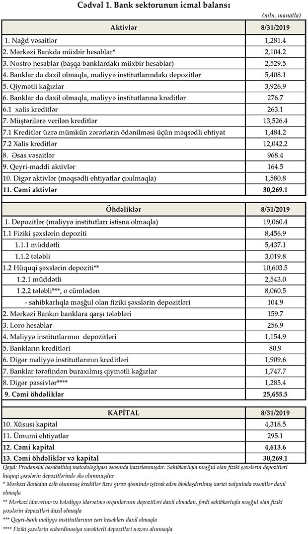 Azərbaycanın bank sektorunun cəmi aktiv böyüklüyü Avqustun sonunda 30 milyard 269 milyon 100 min manat təşkil edib.