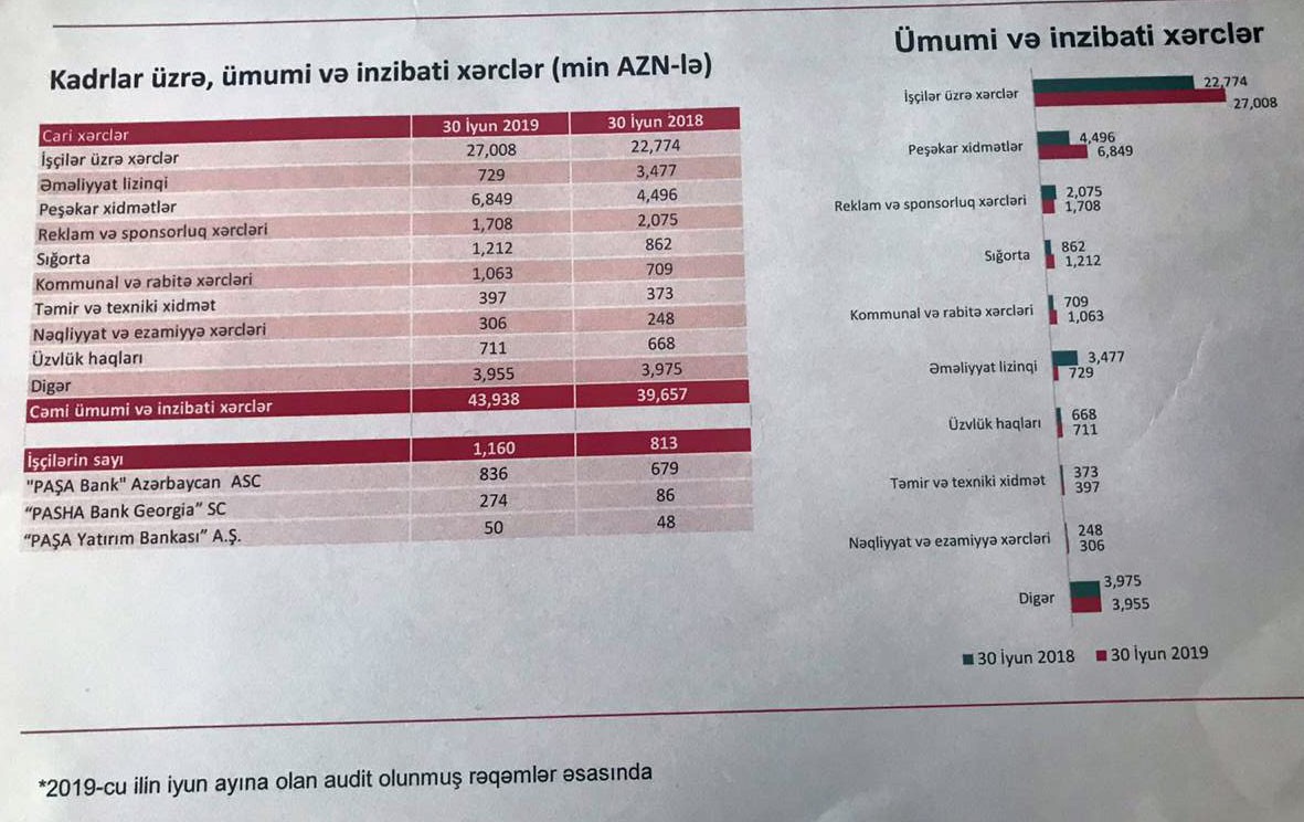 “Marja” şirkətin yarımillik hesabatına istinadən xəbər verir ki, “PAŞA Bank” qrupu 2019-cu ilin ilk 6 ayında işçilər üzrə 27 milyon 8 min manat xərc çəkib. Bu, ötən ilin eyni dövrü ilə müqayisədə 4 milyon 234 min manat və ya 18,6% çoxdur.