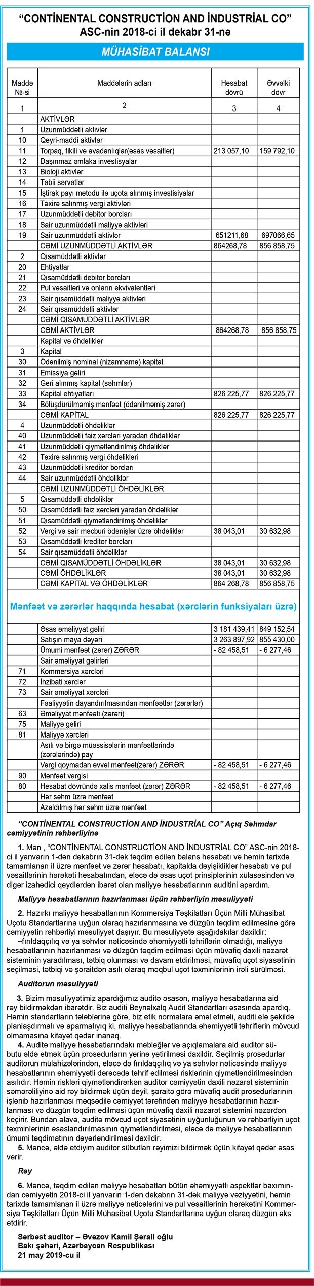 Ötən il gəlirlərinin 4 dəfəyə yaxın artmasına baxmayaraq “Continental Construction and İndustrial CO” mənfəətə çıxa bilməyib