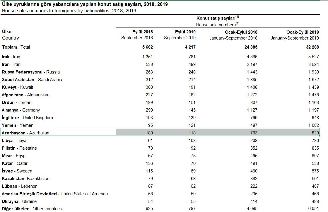 Azərbaycanlılar Türkiyədə mənzil alan xaricilər arasında 11-ci yerdədir. Yanvar - Sentyabr dövründə Türkiyədən ən çox mənzili İraq vətəndaşları alıblar - 5527 mənzil. İraqlıların ardınca 3624 mənzil ilə İran, 1939 mənzil ilə Rusiya vətəndaşları gəlirlər.