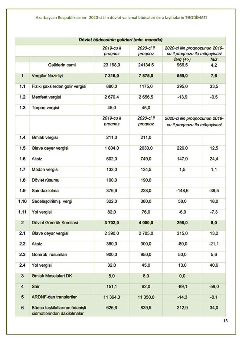 2020-ci il dövlət büdcəsinin gəlirləri 24 milyard 134,5 milyon manat proqnozlaşdırılır, bu da 2019-cu ilin büdcə proqnozu ilə müqayisədə 966,5 milyon manat çoxdur.