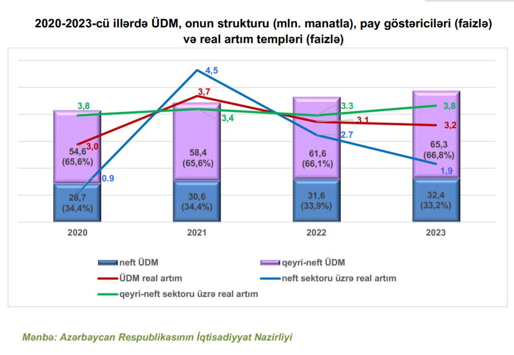 2020-ci ildə ölkədə ÜDM-in real iqtisadi artımı 3 faiz olmaqla 83,3 milyard manat, o cümlədən qeyri-neft ÜDM-in artımı 3,8 faiz olmaqla 54,6 milyard manat proqnozlaşdırılır.