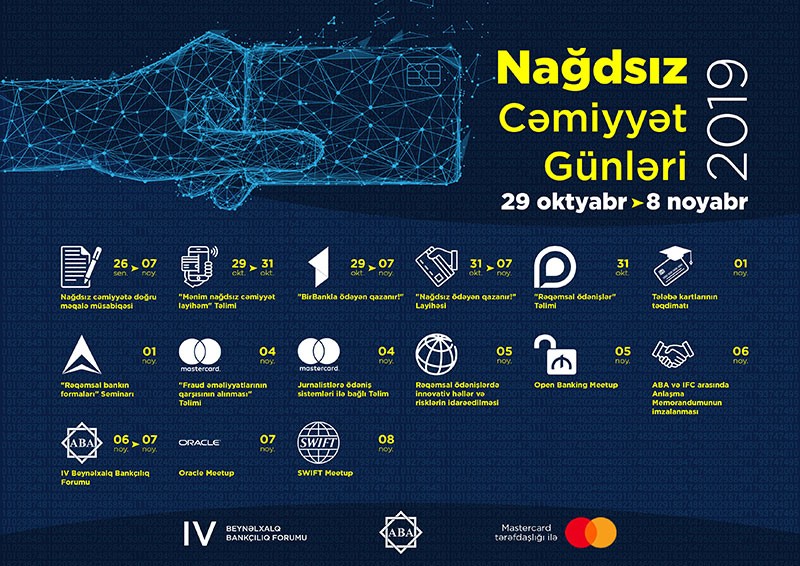 29 oktyabr – 08 noyabr 2019-cu il tarixlərini əhatə edən “Nağdsız cəmiyyət günləri” çərçivəsində keçirilən bu Forumun məqsədi iqtisadiyyatın nağdsızlaşdırılması ilə bağlı təşəbbüslərin və qarşıdakı çağırışların, rəqəmsallaşma, maliyyə texnologiyalarına dair mövcud vəziyyət, yeni və gələcək trendlərin, müasir bank məhsullarının, komplayns sahəsindəki yeniliklər və risklərin, həmçinin sadalananların mövcud hüquqi çərçivəyə uyğunluğu və adaptasiyası imkanlarının, bu proseslərin bankların maliyyə dayanıqlığının daha da gücləndirilməsinə təsiri məsələlərinin, eləcə də digər əlaqədar mövzuların müzakirə edildiyi platforma olmaqdır.