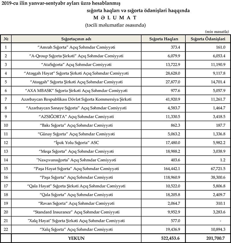 Maliyyə Bazarlarına Nəzarət Palatası (MBNP) 2019-cu ilin yanvar-sentyabr ayları üzrə sığorta şirkətlərinin göstəricilərini açıqlayıb.