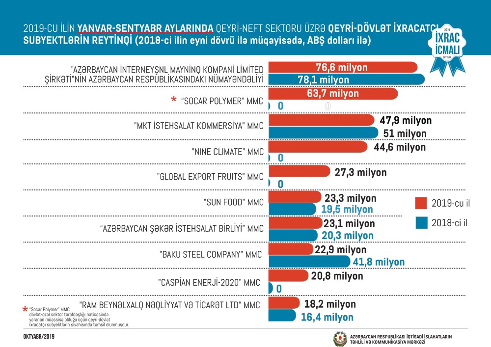 “Marja” xəbər verir ki, “İxrac İcmalı”nın oktyabr sayında qeyri-neft sektoru üzrə əsas ixracatçı şirkətlərin reytinqi verilib. Bu ilin yanvar-sentyabr ayları üzrə hazırlanan qeyri-dövlət ixracatçı subyektlərin reytinqində ilk onluqda aşağıdakı şirkətlər təmsil olunurlar: “"Azərbaycan İnterneyşnl Mayninq Kompani Limited Şirkəti"nin Azərbaycan Respublikasındakı nümayəndəliyi, “Socar Polymer” MMC, "MKT İstehsalat Kommersiya" MMC, "Nine Climate" MMC, "Global Export Fruits" MMC, “Sun Food" MMC, "Azərbaycan Şəkər İstehsalat Birliyi" MMC, "Baku Steel Company", "Caspian enerji-2020" MMC, "Ram Beynəlxalq Nəqliyyat və Ticarət Ltd" MMC.