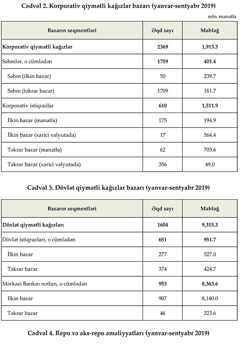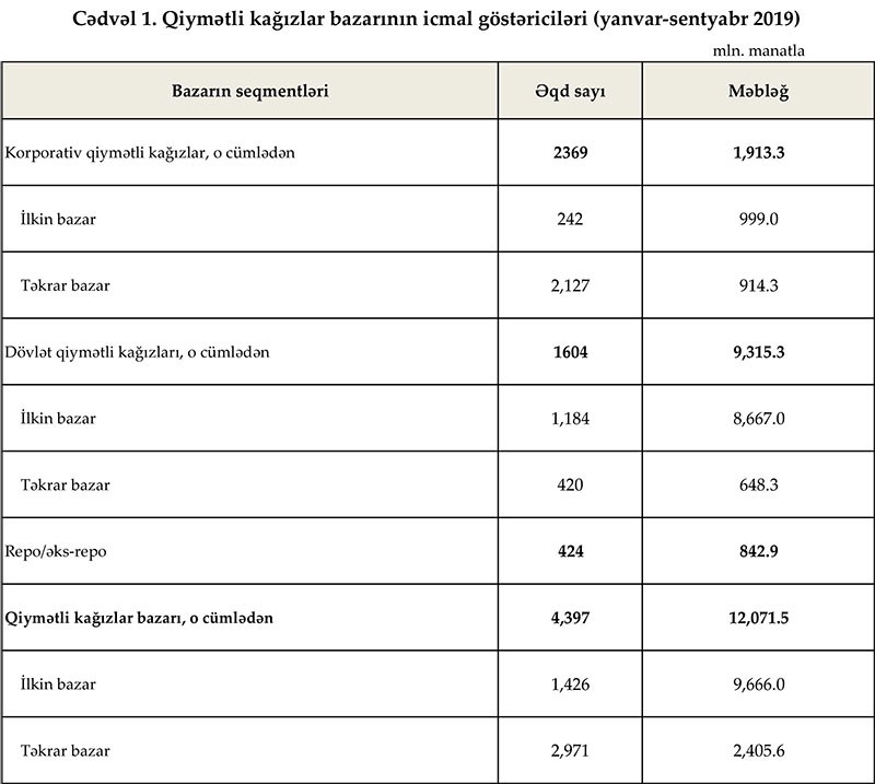 Maliyyə Bazarlarına Nəzarət Palatasının yaydığı məlumata görə, 2019-cu ilin doqquz ay ərzində investisiya qiymətli kağızları bazarında ümumilikdə 12 milyard 71.5 milyon manat həcmində əməliyyat aparılıb. Əməliyyatların 80.1%-i (9 milyard 666 milyon manat) ilkin bazarda, 19.9%-i (2 milyard 405.6 milyon manat) isə təkrar bazarda aparılıb.