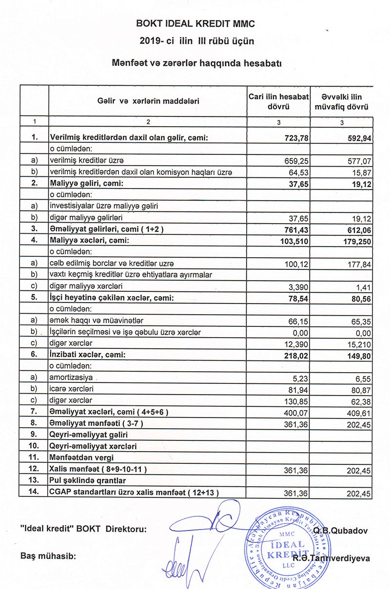 Bank Olmayan Kredit Təşkilatı "İdeal Kredit" MMC 2019-cu ilin 9 ayını 361 min manat xalis mənfəət ilə başa vurub. Bu, ötən ilin eyni dövrü ilə müqayisədə 159 min manat və ya 79% çoxdur.