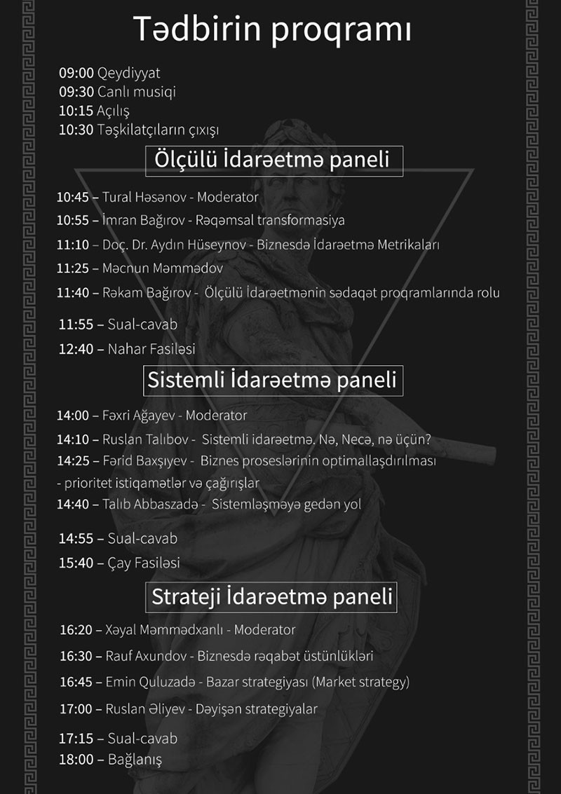 “Ölç, Qur, İdarə et!” lozunqu ilə 400 nəfər sahibkarları və top menecerləri bir araya gətirən forum 08 Noyabr Bulvar oteldə keçiriləcək.